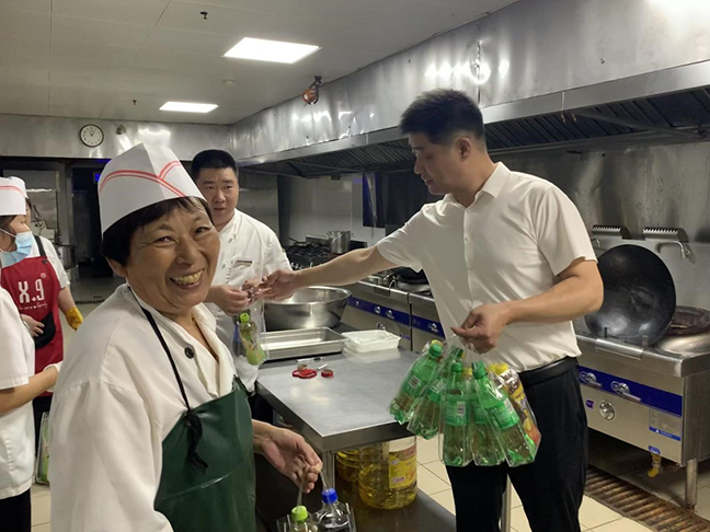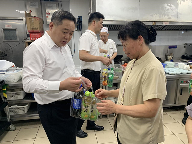 劉晉國一行為堅守在高溫一線(xiàn)的職工們送上慰問(wèn)品,并察看了酒店餐飲接待服務(wù)、廚房菜肴出品、工程施工作業(yè)和康體中心安全管理等方面工作情況。每到一處,劉晉國都同一線(xiàn)職工親切交談,詳細了解防暑降溫和日常工作情況,對他們的愛(ài)崗敬業(yè)精神表示充分肯定,反復叮囑大家要注意勞逸結合、加強自我防護,同時(shí)要求各部門(mén)積極創(chuàng )造條件,改善工作環(huán)境,把防暑降溫工作做細做實(shí)做到位,不斷提升職工的獲得感、幸福感和歸屬感。