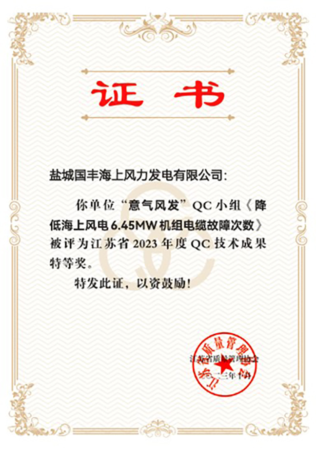 日前,從江蘇省質(zhì)量管理協(xié)會(huì )傳來(lái)喜訊,鹽城國豐公司《降低海上風(fēng)電6.45MW 機組電纜故障次數》質(zhì)量管理成果榮獲江蘇省2023年度QC技術(shù)成果特等獎,同時(shí),公司QC小組被評為2023年江蘇省優(yōu)秀質(zhì)量管理小組。