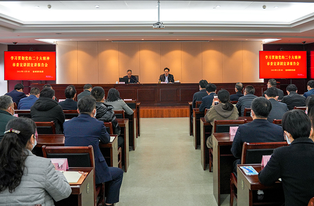 為深入學(xué)習貫徹黨的二十大精神,扎實(shí)推動(dòng)黨的二十大精神入腦入心、走深走實(shí),根據市委統一部署,12月3日上午,學(xué)習貫徹黨的二十大精神市委宣講團宣講報告會(huì )在鹽城國投集團舉行。市委宣講團成員、鹽城工學(xué)院黨委常委、宣傳部部長(cháng)奚新國作宣講報告。集團黨委書(shū)記、董事長(cháng)張林海主持報告會(huì )并講話(huà)。集團黨委班子成員,市委派駐集團黨建工作指導員陳中才,集團中層以上干部參加報告會(huì )。